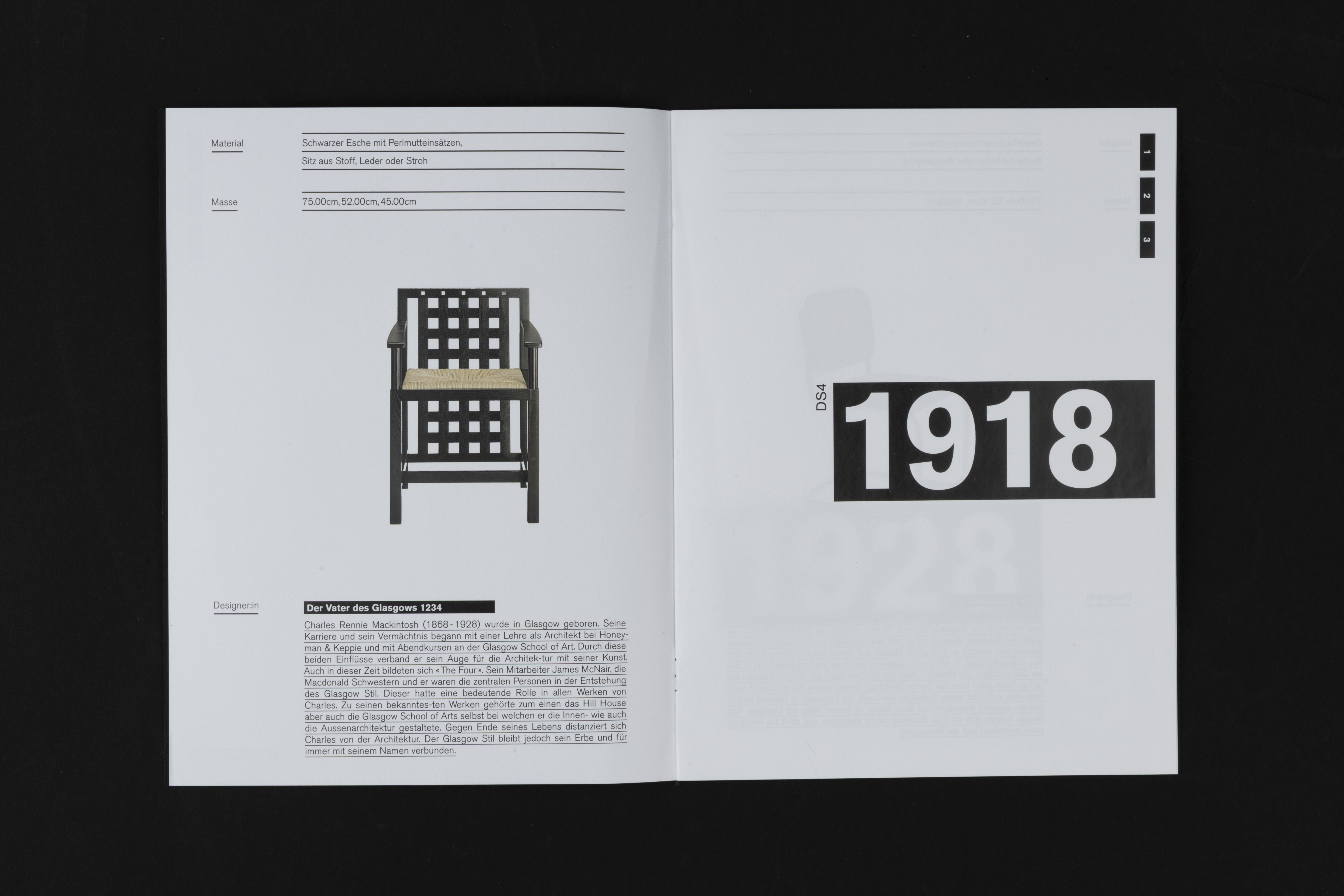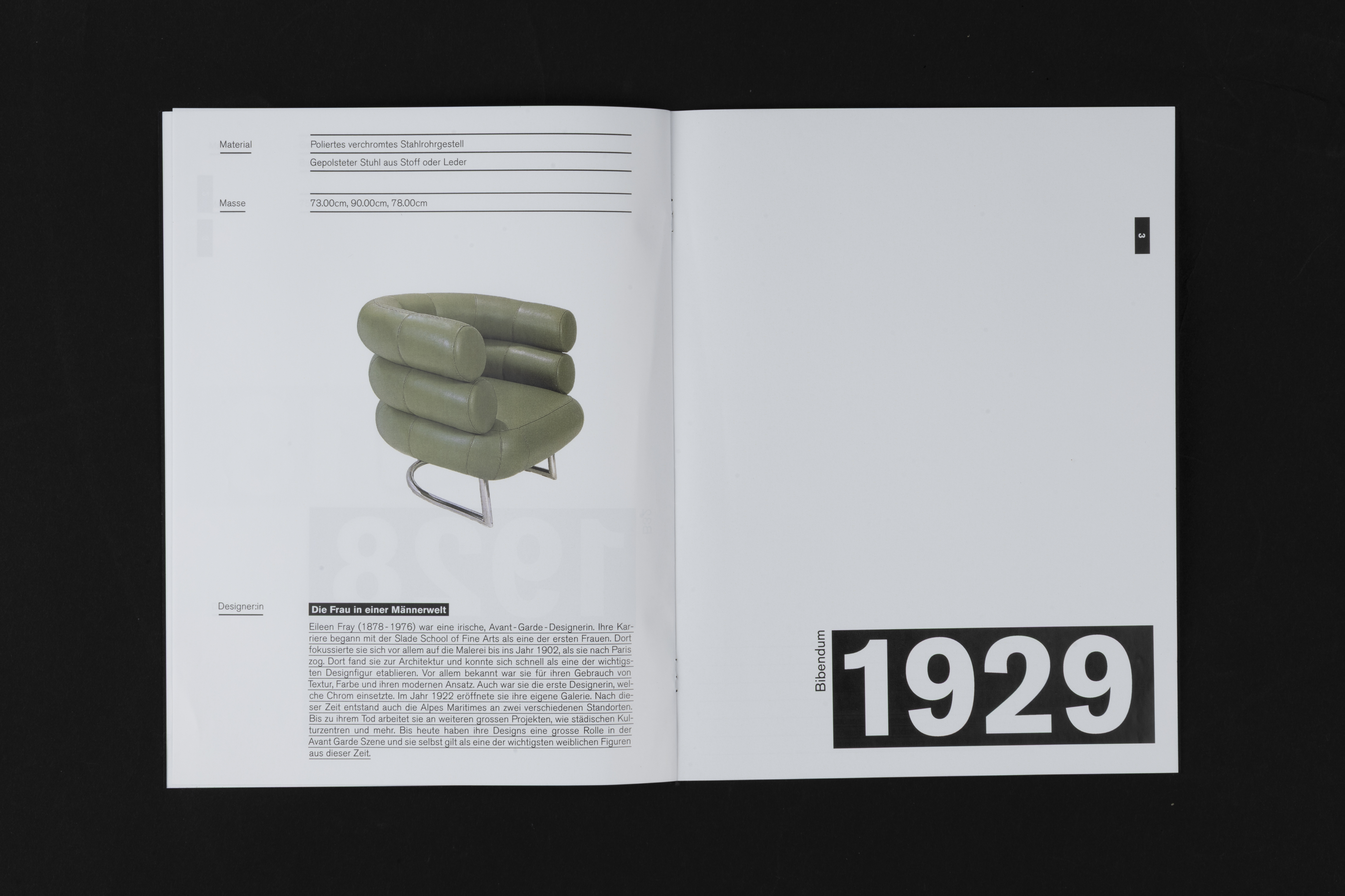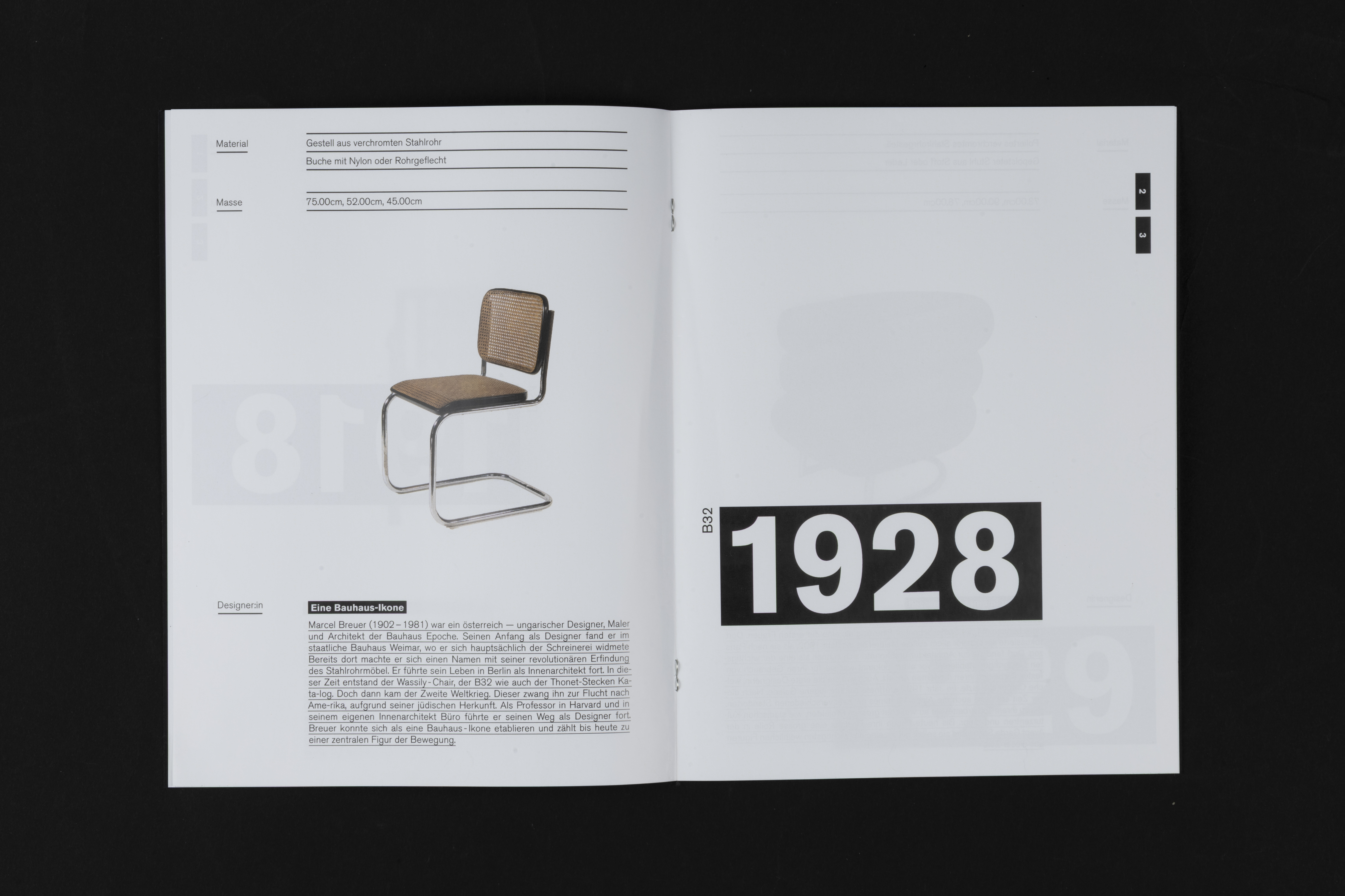 Ein Katalog, gewidmet drei Designer: innen, die von derselben Ära inspiriert und geprägt wurden. Er greift die Sprache der Designobjekte auf und interpretiert sie neu. Über die Seiten hinweg sind Einflüsse der Bauhaus-Grafik erkennbar. Starke Kontraste und kubistische Elemente geben den Stühlen Raum, um wahrgenommen zu werden, und erinnern an ein Archiv. Auch in der Materialität des Katalogs findet sich die Bauhaus-Architektur wieder: Die Seiten tragen das Gefühl von Beton und Glas. Alle Elemente zusammen bilden eine Zeitkapsel der Designgeschichte.